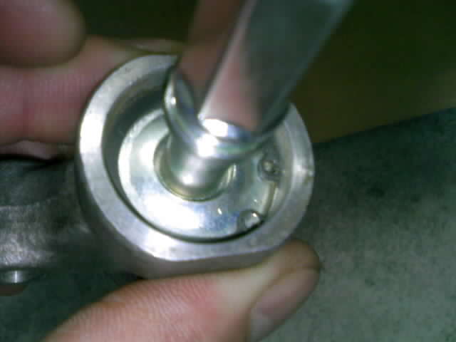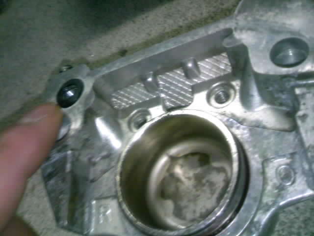 指でさしてる場所のOリングは、ヤマハじゃ単品で部品が出ないんだけど、カワサキの純正部品(43049-1004)が使えるんでソイツを入れる。