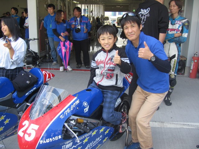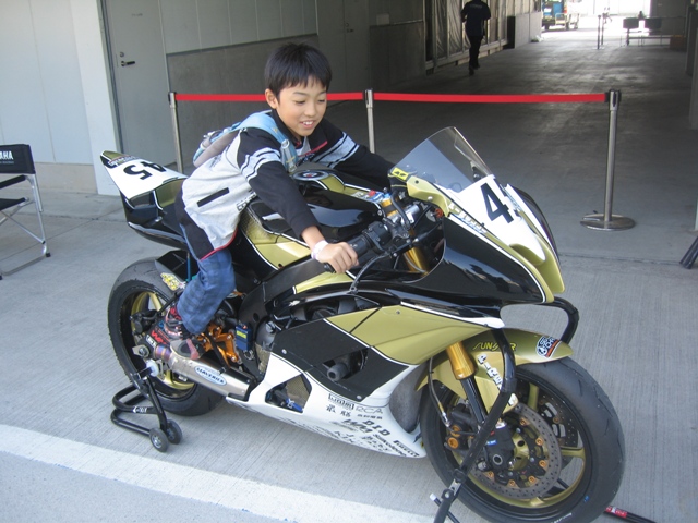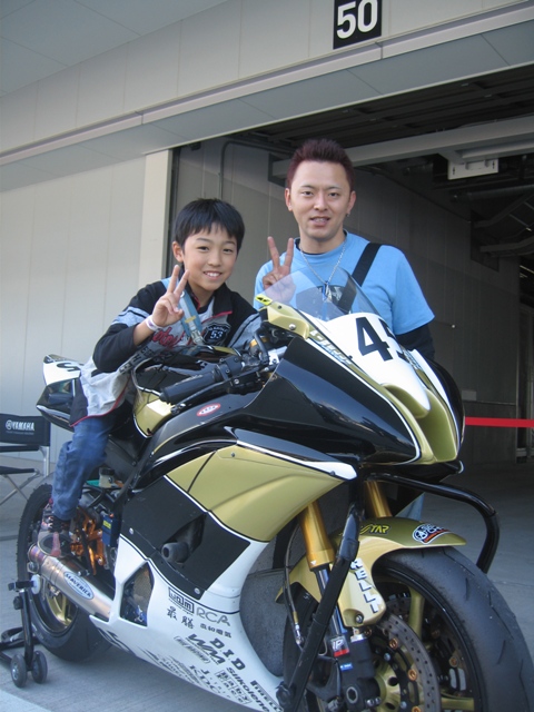 チーム【犬の乳酸菌.JP】の江崎屋学選手のPRCS250F(ヤマハ)に跨がって楽しそうな息子。