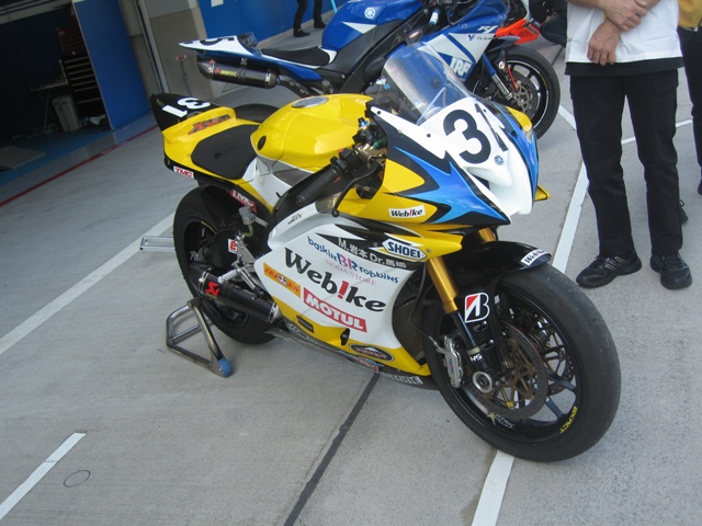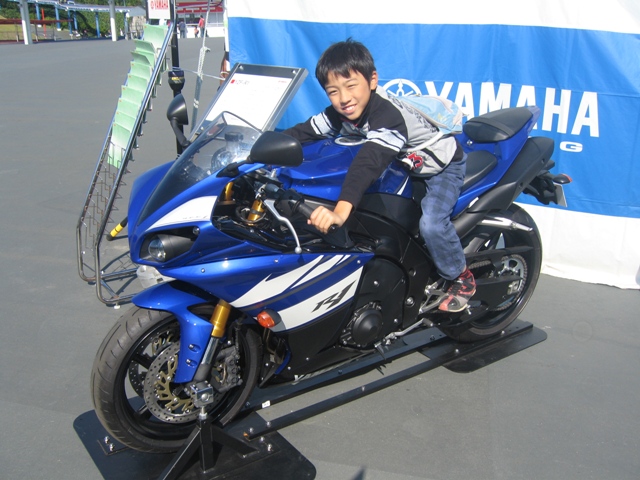 その後、サーキットの外にあったヤマハのブースにてYZF―R1に跨がって